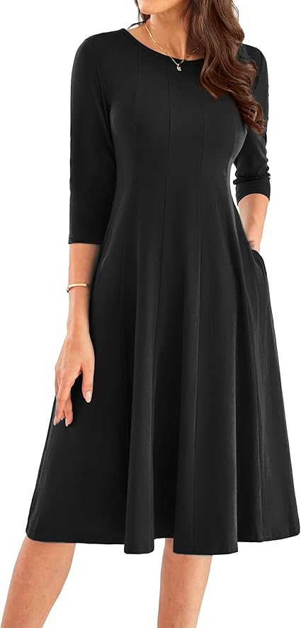 Womens 2024 Fall Trendy Crew Neck 3/4 Sleeve A Line Flowy Casual Midi Dress with Pockets