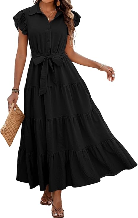 Women's Summer Casual Dresses 2024 Cap Ruffle Sleeve V Neck Button Belted Tiered Boho Maxi Dress with Pockets