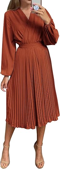 Women's Spring Midi Dress Long Puff Sleeve Wrap V Neck Flowy Ruffle Pleated Casual Fall Dresses