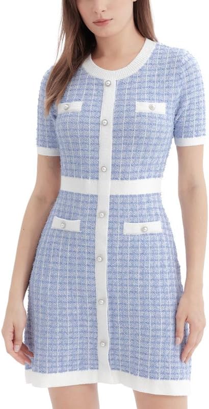 Women's Short Sleeve Tweed Knitted Sweater Dress Pearl Button Mini Dresses for Spring Summer Fall