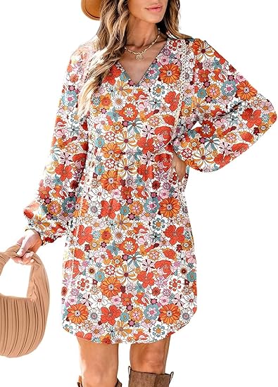 Women's V Neck Floral Embroidered Lace Trim Mini Dress Long Peasant Sleeves Flowy Dress Fall Dresses