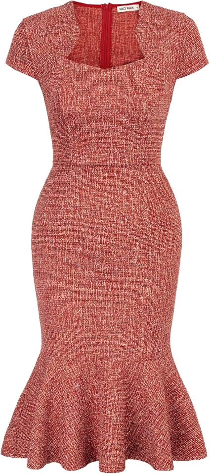 Womens Elegant Cap Sleeve Fishtail Midi Tweed Bodycon Dress