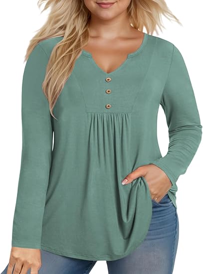 Womens-Plus-Size-Dressy-Tops Cute V Neck Henley Shirts Flowy Pleated Long Sleeve Tunic Fall Casual Buttons Up Blouses