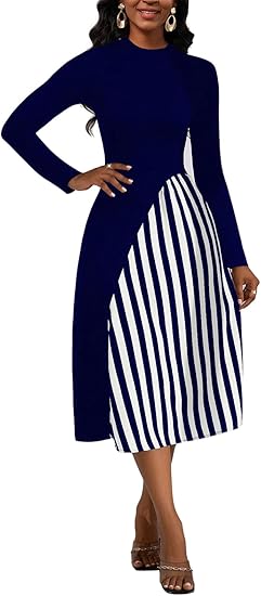 Women's Casual Crew Neck Long Sleeve Dress 2024 Splice Striped Midi Dress Pencil Cocktail Dresses