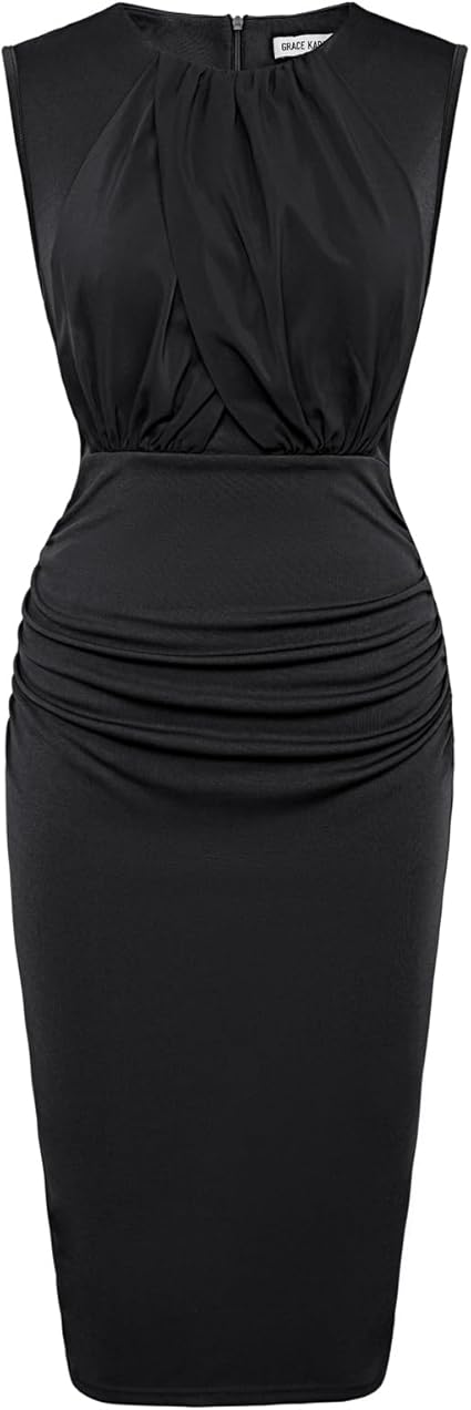 Women's Ruched Bodycon Dress Summer Sleeveless Front Drape Patchwork Crew Neck Midi Cocktail Dress