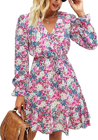 Women Casual Summer Fall Dresses Long Sleeve Floral Wrap V Neck High Waist Ruffle Tiered A Line Flowy Mini Dress