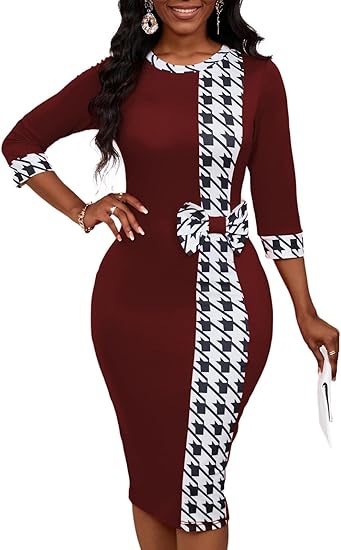Women's 3/4 Sleeve Round Neck Casual Houndstooth Bodycon Wear to Work Pencil Sheath Midi Dresses