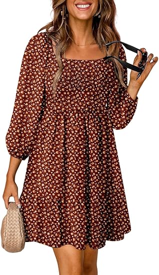 Womens Summer Fall Dresses 2024 Boho Floral Square Neck Smocked 3/4 Sleeve Casual A-Line Swing Mini Babydoll Dress