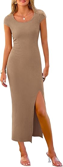 Women's Bodycon Maxi Dress Casual Summer Cap Sleeve Ribbed Knit Fitted Party Club Long Slit Dresses