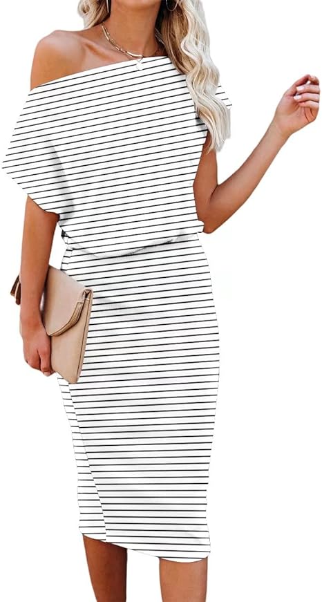 Women's 2024 Summer Dress Off The Shoulder Short Sleeve Ribbed Casual Party Bodycon Midi Dresses