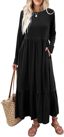 Women's Long Sleeves Maxi Dress Casual Loose Tiered Flowy Swing Beach Long Dresses with Pockets