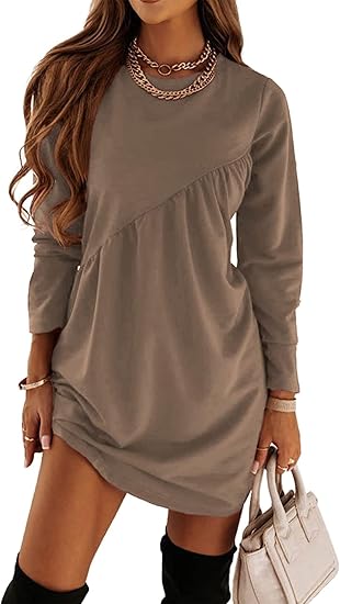 Women's Long Sleeve Mini Tunic Dress Casual Crewneck Loose Flowy Shift Ruched Dresses