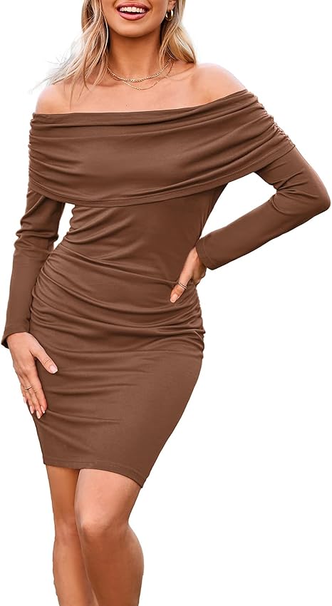 Women's Sexy Elegant Ruched Bodycon Dresses Off Shoulder Long Sleeve Cocktail Party Midi Dress