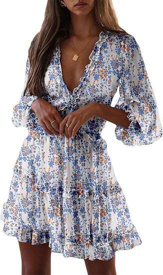Womens 2024 Summer Fall Deep V Neck Long Sleeve Backless Ruffle Floral Flowy Mini Dress