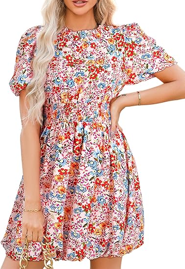 Womens Boho Dresses Crewneck Puff Sleeve Tie Back Smocked Empire Waist Beach Floral Mini Dresses